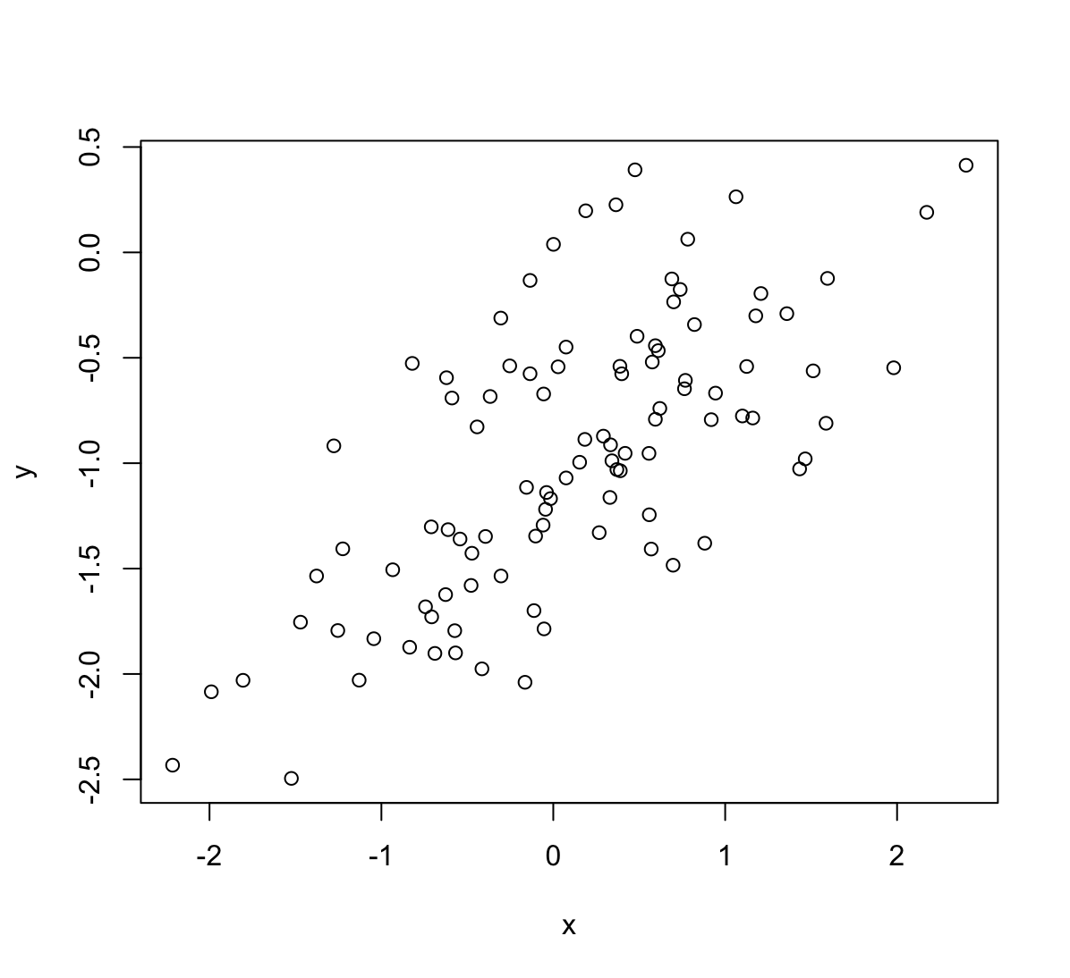 Rwith $n = 100$ observations in which the coefficient estimate for the regression of $X$ onto $Y$ is different from the coefficient estimate for the regression of $Y$ onto $X$.set.seed(1) x <- rnorm(100) y <- 2 * x + rnorm(100)(c) Generate an example in