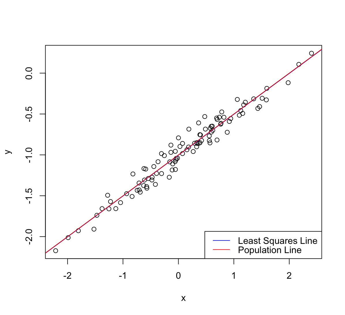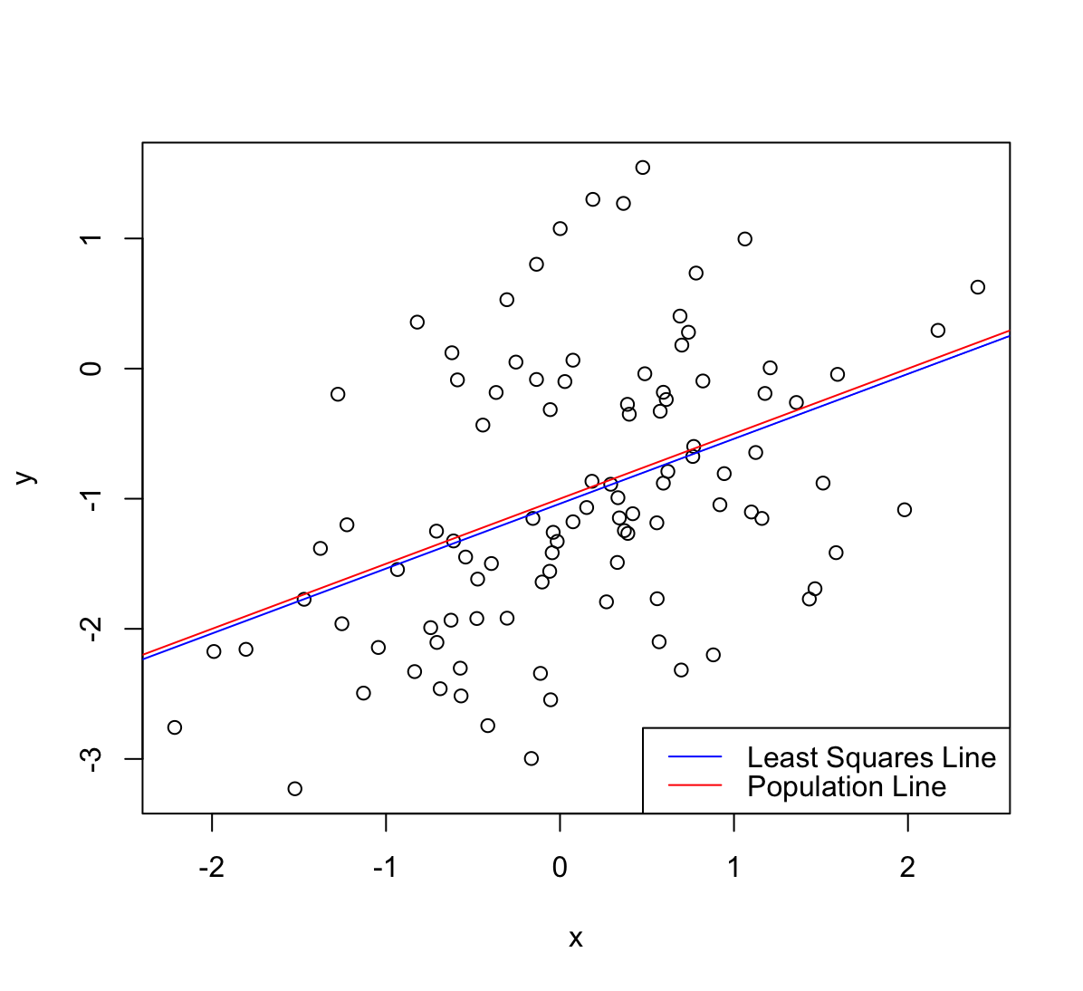 legend()command to create an appropriate legend.abline(lm.fit, lwd=1, col ="blue") abline(a=-1, b=0.5, lwd=1, col="red") legend('bottomright', legend=c('Least Squares Line', 'Population Line'), col=c('blue','red'), lty = c(1, 1))