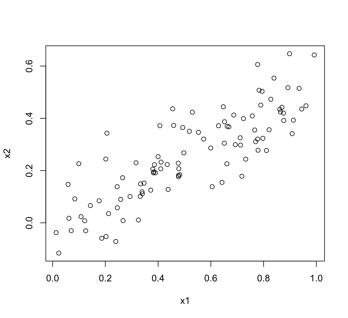 R:set.seed(1) x1 <- runif(100) x2 <- 0.5 * x1 + rnorm(100) / 10 y <- 2 + 2 * x1 + 0.3 * x2 + rnorm(100)The last line corresponds to creating a linear model in which