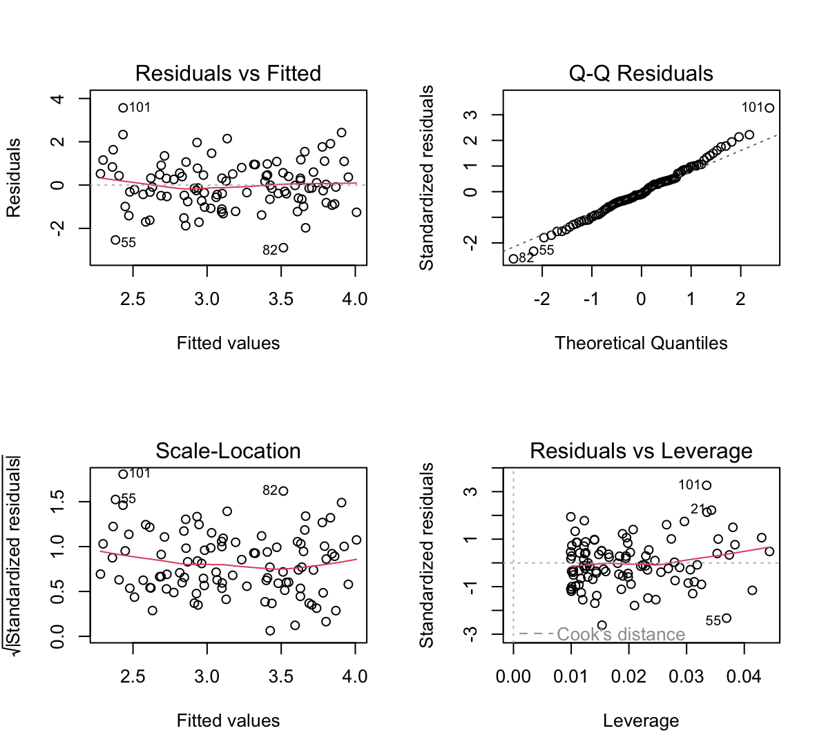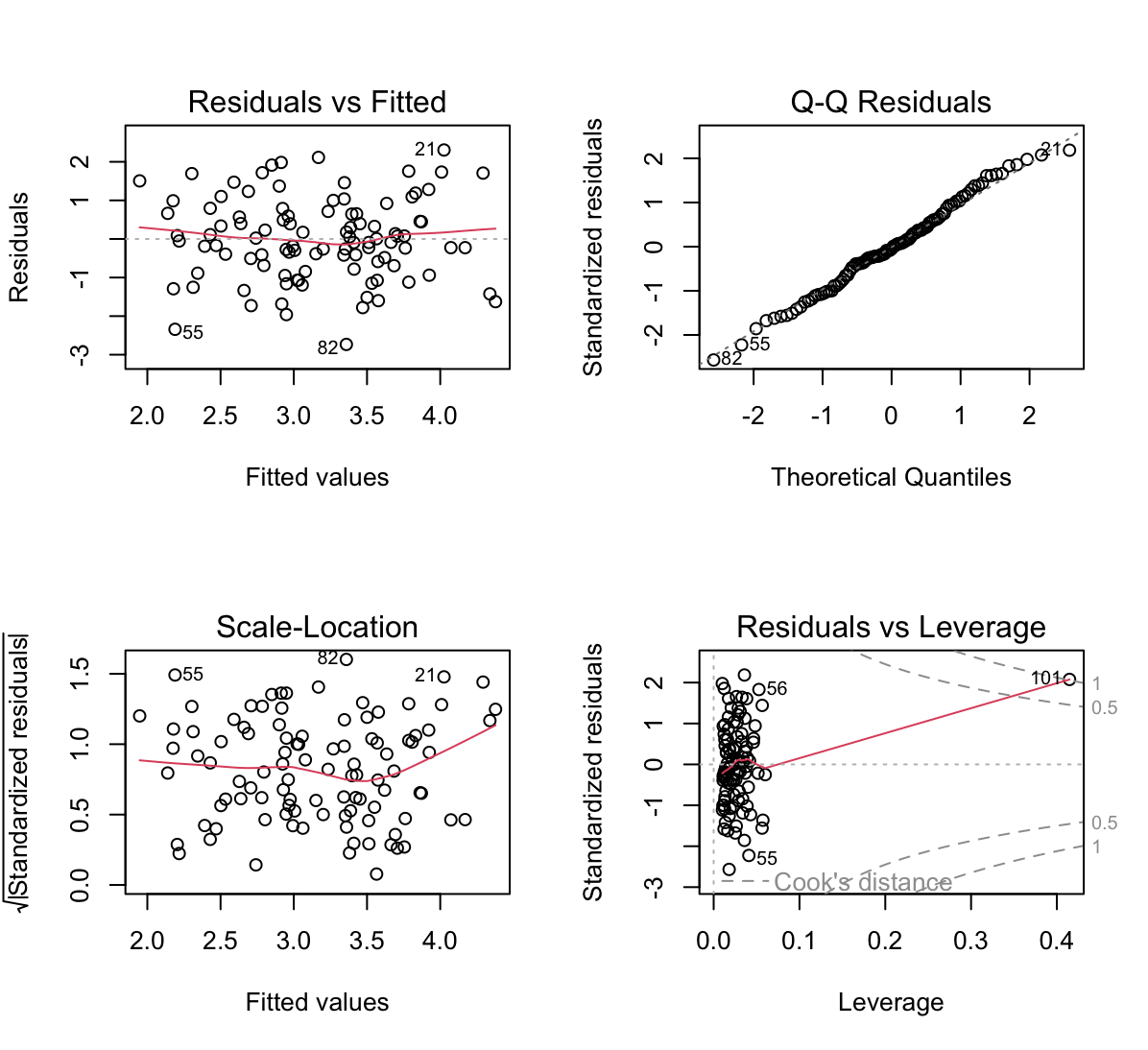 par(mfrow=c(2,2)) lm.fit <- lm(y~x1+x2) plot(lm.fit) rstudent(lm.fit)[which(rstudent(lm.fit)>3)]named numeric(0)hatvalues(lm.fit)[order(hatvalues(lm.fit), decreasing = T)][1]101 0.4147284