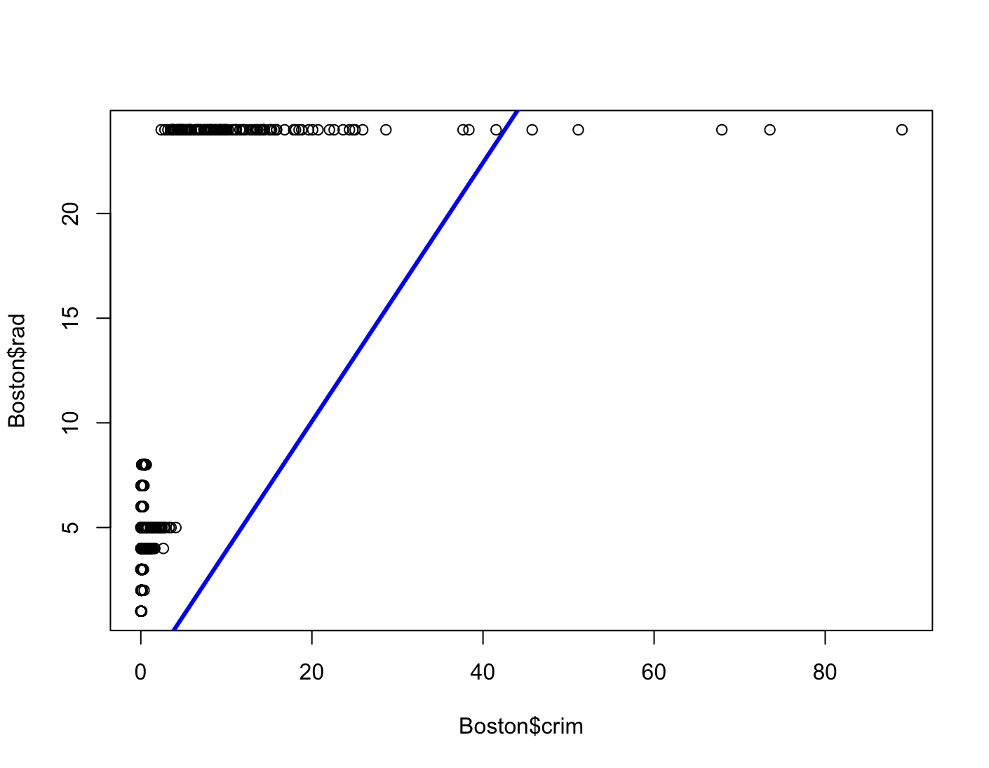 lm.fit = lm(crim~rad, data=Boston) plot(Boston$crim, Boston$rad) abline(lm.fit, col="blue", lwd=3)