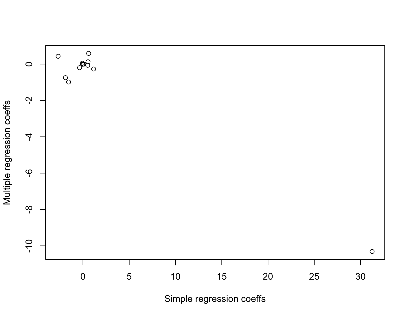 simple_coefs = c() multip_coefs = c() for (x in columns) { lm = lm(paste("crim", "~", x), data=Boston) simple_coefs = c(simple_coefs, summary(lm)$coefficients[2,1]) multip_coefs = c(multip_coefs, summary(lm.fit2)$coefficients[-1,1][x]) } plot(simple_coefs, multip_coefs, xlab="Simple regression coeffs", ylab="Multiple regression coeffs")