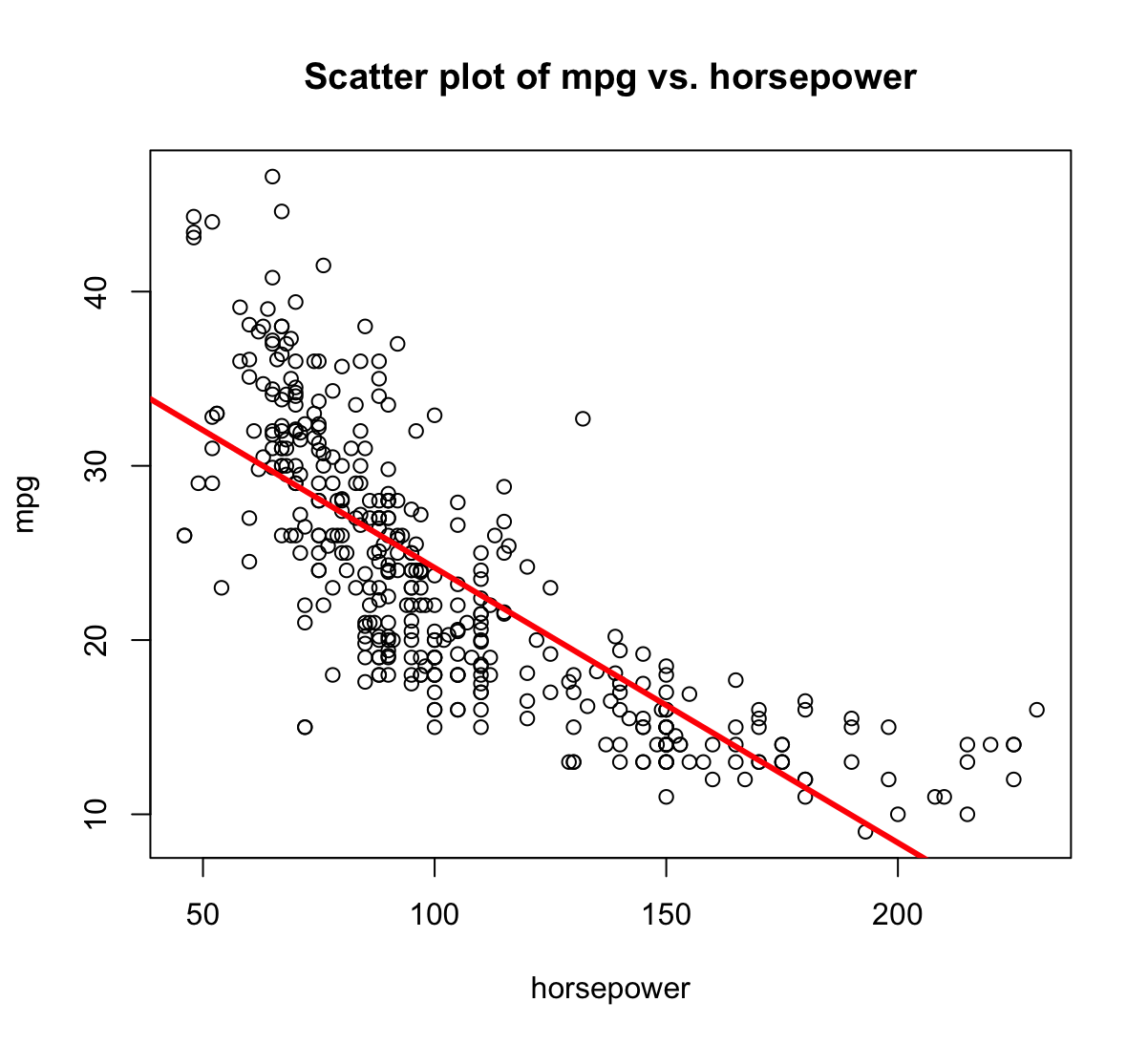 abline()function to display the least squares regression line.plot(mpg~horsepower,main= "Scatter plot of mpg vs. horsepower", data=Auto) abline(mpg_pwr, lwd =3, col ="red")