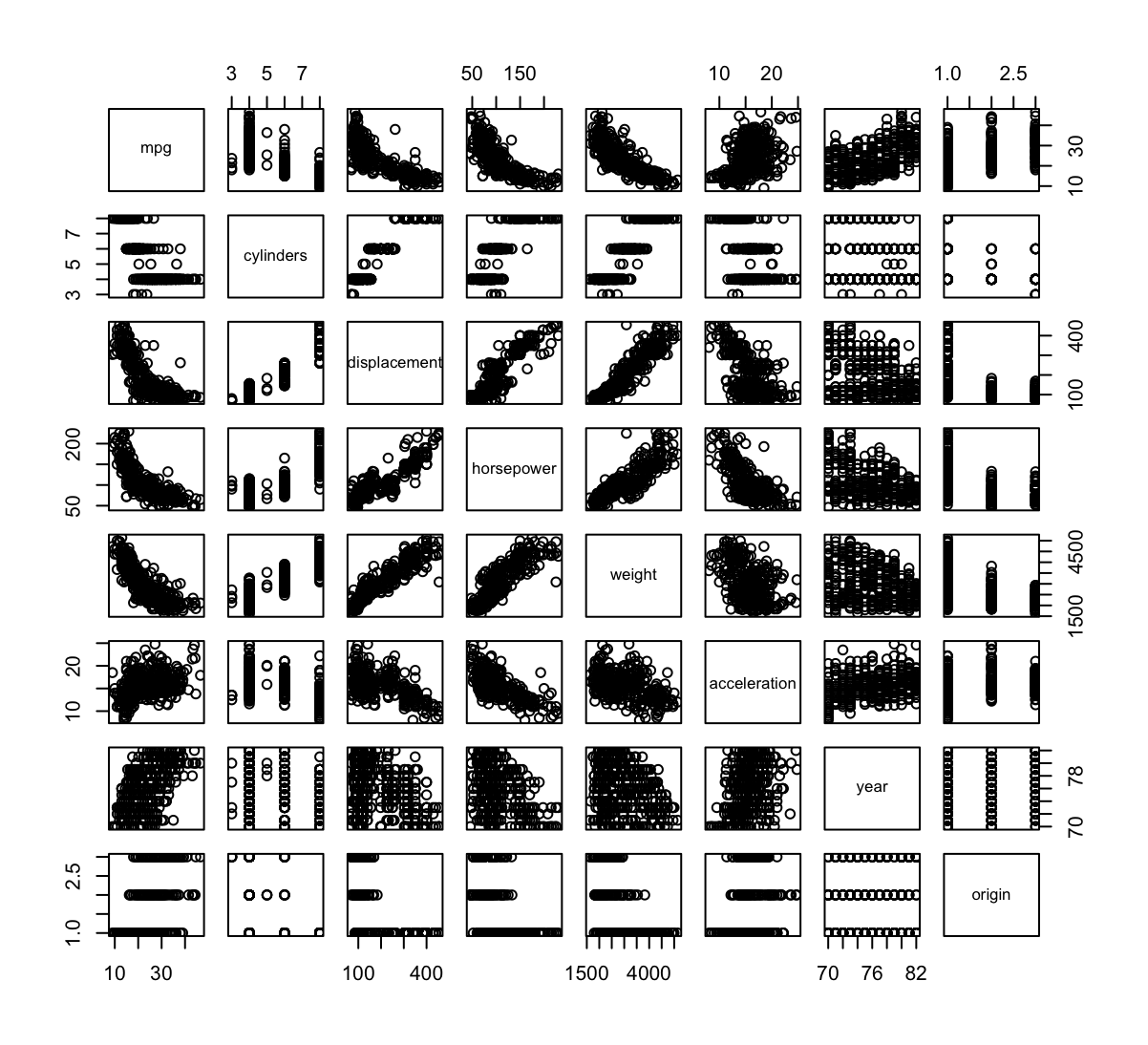 cor(). You will need to exclude thenamevariable, which is qualitative.cor(Auto)mpg cylinders displacement horsepower weight acceleration mpg 1.0000000 -0.7776175 -0.8051269 -0.7784268 -0.8322442 0.4233285 cylinders -0.7776175 1.0000000 0.9508233 0.8429834 0.8975273 -0.5046834 displacement -0.8051269 0.9508233 1.0000000 0.8972570 0.9329944 -0.5438005 horsepower -0.7784268 0.8429834 0.8972570 1.0000000 0.8645377 -0.6891955 weight -0.8322442 0.8975273 0.9329944 0.8645377 1.0000000 -0.4168392 acceleration 0.4233285 -0.5046834 -0.5438005 -0.6891955 -0.4168392 1.0000000 year 0.5805410 -0.3456474 -0.3698552 -0.4163615 -0.3091199 0.2903161 origin 0.5652088 -0.5689316 -0.6145351 -0.4551715 -0.5850054 0.2127458 year origin mpg 0.5805410 0.5652088 cylinders -0.3456474 -0.5689316 displacement -0.3698552 -0.6145351 horsepower -0.4163615 -0.4551715 weight -0.3091199 -0.5850054 acceleration 0.2903161 0.2127458 year 1.0000000 0.1815277 origin 0.1815277 1.0000000(c) Use the