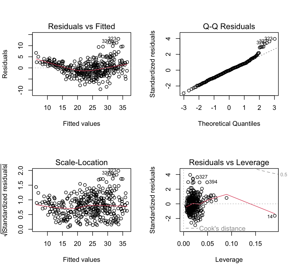 plot()function to produce diagnostic plots of the linear regression fit. Comment on any problems you see with the fit. Do the residual plots suggest any unusually large outliers? Does the leverage plot identify any observations with unusually high leverage?par(mfrow=c(2,2)) plot(mpg_all)