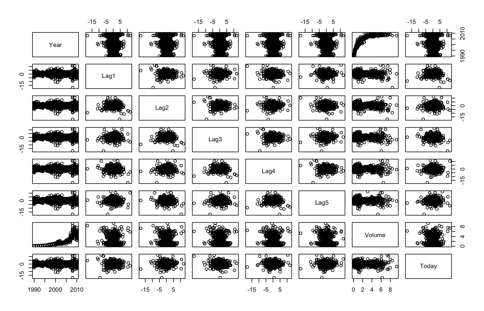 Weeklydata. Do there appear to be any patterns?library(ISLR) summary(Weekly)Year Lag1 Lag2 Lag3 Lag4 Min. :1990 Min. :-18.1950 Min. :-18.1950 Min. :-18.1950 Min. :-18.1950 1st Qu.:1995 1st Qu.: -1.1540 1st Qu.: -1.1540 1st Qu.: -1.1580 1st Qu.: -1.1580 Median :2000 Median : 0.2410 Median : 0.2410 Median : 0.2410 Median : 0.2380 Mean :2000 Mean : 0.1506 Mean : 0.1511 Mean : 0.1472 Mean : 0.1458 3rd Qu.:2005 3rd Qu.: 1.4050 3rd Qu.: 1.4090 3rd Qu.: 1.4090 3rd Qu.: 1.4090 Max. :2010 Max. : 12.0260 Max. : 12.0260 Max. : 12.0260 Max. : 12.0260 Lag5 Volume Today Direction Min. :-18.1950 Min. :0.08747 Min. :-18.1950 Down:484 1st Qu.: -1.1660 1st Qu.:0.33202 1st Qu.: -1.1540 Up :605 Median : 0.2340 Median :1.00268 Median : 0.2410 Mean : 0.1399 Mean :1.57462 Mean : 0.1499 3rd Qu.: 1.4050 3rd Qu.:2.05373 3rd Qu.: 1.4050 Max. : 12.0260 Max. :9.32821 Max. : 12.0260pairs(Weekly[,1:8])