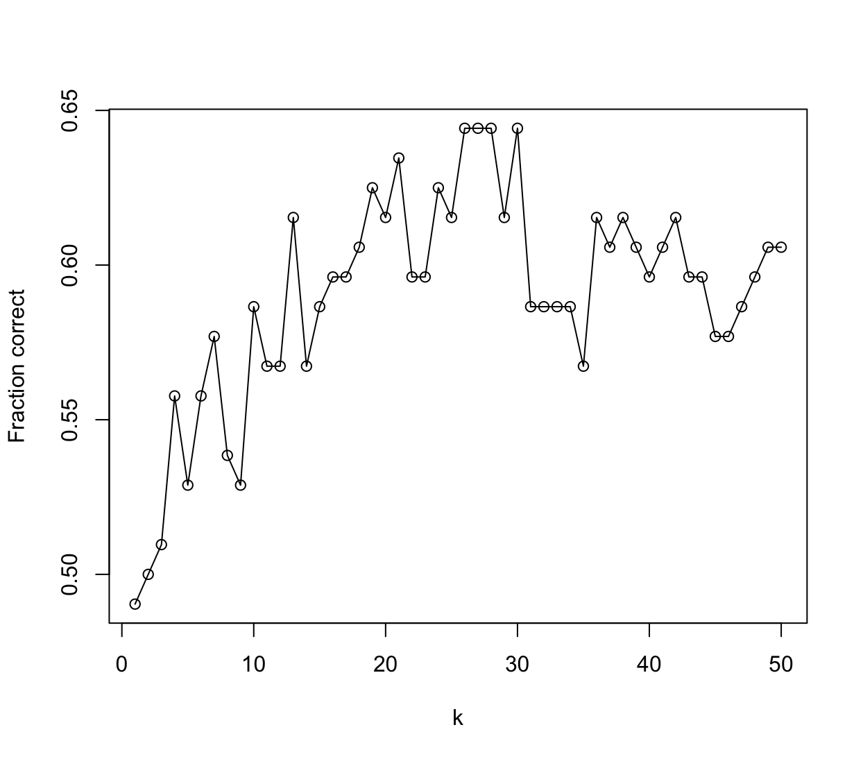 # LDA fit.lda <- lda(Direction ~ Lag2 + Volume + Lag2:Volume, data = Weekly[train,]) fit.lda.pred <- predict(fit.lda, Weekly[!train,], type = "response")$class t <- table(fit.lda.pred, Weekly[!train, ]$Direction) sum(diag(t)) / sum(t)[1] 0.5384615# QDA fit.qda <- qda(Direction ~ Lag2 + Volume + Lag2:Volume, data = Weekly[train,]) fit.qda.pred <- predict(fit.qda, Weekly[!train,], type = "response")$class t <- table(fit.qda.pred, Weekly[!train, ]$Direction) sum(diag(t)) / sum(t)[1] 0.4711538# Naive Bayes - funkcja nie przyjmuje interakcji fit <- naiveBayes(Direction ~ Lag2 + Volume, data = Weekly[train, ]) pred <- predict(fit, Weekly[!train, ], type = "class") t <- table(pred, Weekly[!train, ]$Direction) sum(diag(t)) / sum(t)[1] 0.4519231# KNN set.seed(1) res <- sapply(1:50, function(k) { fit <- knn( Weekly[train, 2:4, drop = FALSE], Weekly[!train, 2:4, drop = FALSE], Weekly$Direction[train], k = k ) t <- table(fit, Weekly[!train, ]$Direction) sum(diag(t)) / sum(t) }) plot(1:50, res, type = "o", xlab = "k", ylab = "Fraction correct")