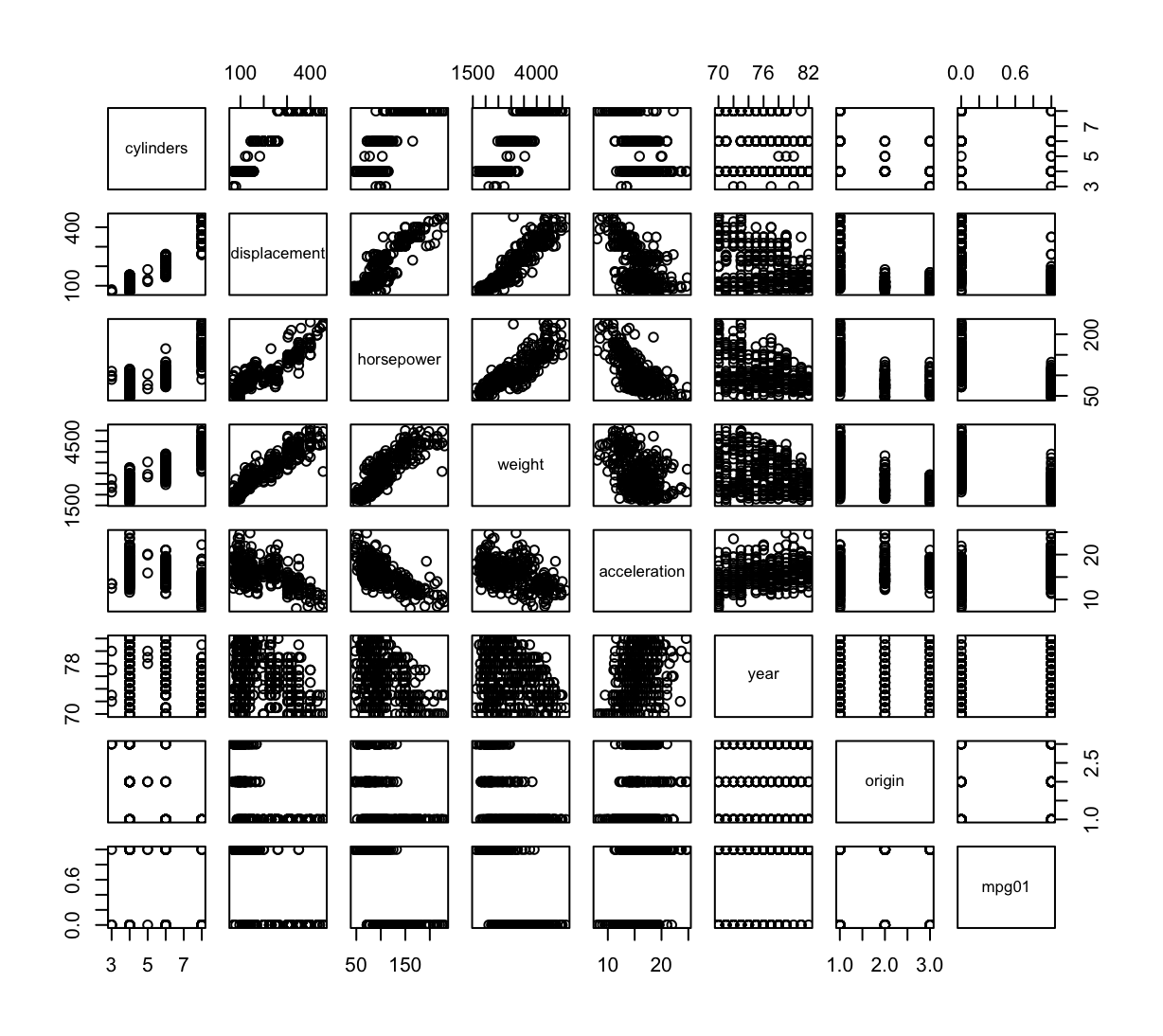 mpg01and the other features. Which of the other features seem most likely to be useful in predictingmpg01? Scatterplots and boxplots may be useful tools to answer this question. Describe your findings.pairs(Auto_2) cor(Auto_2)cylinders displacement horsepower weight acceleration cylinders 1.0000000 0.9508233 0.8429834 0.8975273 -0.5046834 displacement 0.9508233 1.0000000 0.8972570 0.9329944 -0.5438005 horsepower 0.8429834 0.8972570 1.0000000 0.8645377 -0.6891955 weight 0.8975273 0.9329944 0.8645377 1.0000000 -0.4168392 acceleration -0.5046834 -0.5438005 -0.6891955 -0.4168392 1.0000000 year -0.3456474 -0.3698552 -0.4163615 -0.3091199 0.2903161 origin -0.5689316 -0.6145351 -0.4551715 -0.5850054 0.2127458 mpg01 -0.7591939 -0.7534766 -0.6670526 -0.7577566 0.3468215 year origin mpg01 cylinders -0.3456474 -0.5689316 -0.7591939 displacement -0.3698552 -0.6145351 -0.7534766 horsepower -0.4163615 -0.4551715 -0.6670526 weight -0.3091199 -0.5850054 -0.7577566 acceleration 0.2903161 0.2127458 0.3468215 year 1.0000000 0.1815277 0.4299042 origin 0.1815277 1.0000000 0.5136984 mpg01 0.4299042 0.5136984 1.0000000