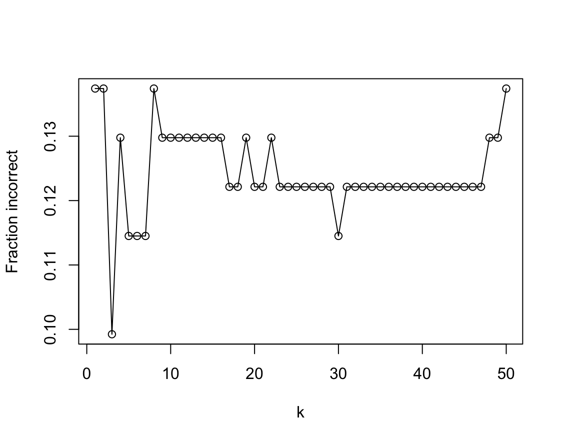mpg01. Use only the variables that seemed most associated withmpg01in (b). What test errors do you obtain? Which value of $K$ seems to perform the best on this data set?library(class) res <- sapply(1:50, function(k) { fit <- knn( Auto_2[train, 2:4, drop = FALSE], Auto_2[-train, 2:4, drop = FALSE], Auto_2$mpg01[train], k = k ) t <- table(fit, Auto_2[-train, ]$mpg01) 1 - sum(diag(t)) / sum(t) }) plot(1:50, res, type = "o", xlab = "k", ylab = "Fraction incorrect")