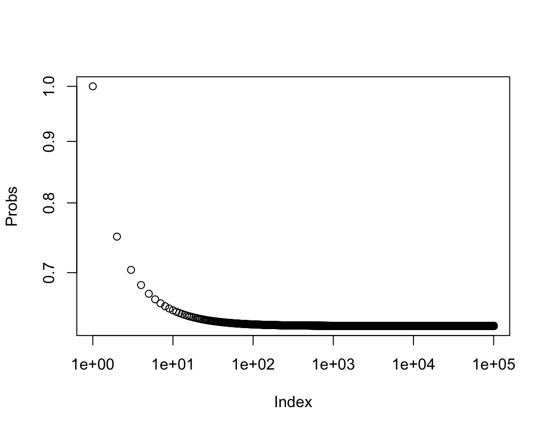 prob(10000)[1] 0.632139(g) Create a plot that displays, for each integer value of $n$ from $1$ to $100000$, the probability that the $j$th observation is in the bootstrap sample. Comment on what you observe.