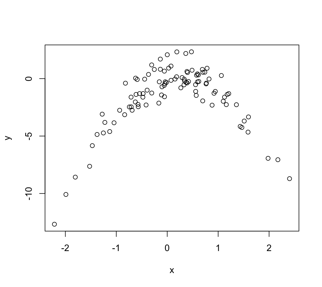 for (i in 1:4) printCoefmat(coef(summary(glm(y ~ poly(x, i), data = data))))Estimate Std. Error t value Pr(>|t|) (Intercept) -1.68329 0.25484 -6.6053 2.066e-09 *** poly(x, i) 4.32330 2.54839 1.6965 0.09297 . --- Signif. codes: 0 ‘***’ 0.001 ‘**’ 0.01 ‘*’ 0.05 ‘.’ 0.1 ‘ ’ 1 Estimate Std. Error t value Pr(>|t|) (Intercept) -1.683288 0.097044 -17.346 < 2.2e-16 *** poly(x, i)1 4.323302 0.970442 4.455 2.249e-05 *** poly(x, i)2 -23.347133 0.970442 -24.058 < 2.2e-16 *** --- Signif. codes: 0 ‘***’ 0.001 ‘**’ 0.01 ‘*’ 0.05 ‘.’ 0.1 ‘ ’ 1 Estimate Std. Error t value Pr(>|t|) (Intercept) -1.683288 0.097501 -17.2643 < 2.2e-16 *** poly(x, i)1 4.323302 0.975012 4.4341 2.46e-05 *** poly(x, i)2 -23.347133 0.975012 -23.9455 < 2.2e-16 *** poly(x, i)3 0.297132 0.975012 0.3047 0.7612 --- Signif. codes: 0 ‘***’ 0.001 ‘**’ 0.01 ‘*’ 0.05 ‘.’ 0.1 ‘ ’ 1 Estimate Std. Error t value Pr(>|t|) (Intercept) -1.683288 0.097424 -17.2780 < 2.2e-16 *** poly(x, i)1 4.323302 0.974239 4.4376 2.449e-05 *** poly(x, i)2 -23.347133 0.974239 -23.9645 < 2.2e-16 *** poly(x, i)3 0.297132 0.974239 0.3050 0.7610 poly(x, i)4 1.045830 0.974239 1.0735 0.2858 --- Signif. codes: 0 ‘***’ 0.001 ‘**’ 0.01 ‘*’ 0.05 ‘.’ 0.1 ‘ ’ 1Na podstawie $p$-value widać, że istotne statystycznie są współczynniki $\beta_0$, $\beta_1$ i $\beta_2$
