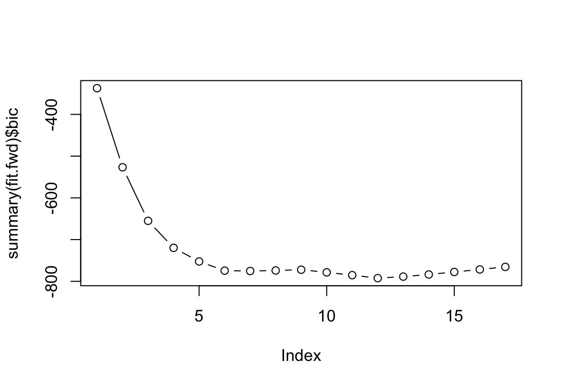 library(ISLR2) library(leaps) attach(College) train <- sample(nrow(College), nrow(College) * 4 / 5) fit.fwd <- regsubsets(Outstate~., data = College[train, ], nvmax=17, method="forward") plot(summary(fit.fwd)$bic, type = "b") which.min(summary(fit.fwd)$bic)[1] 12