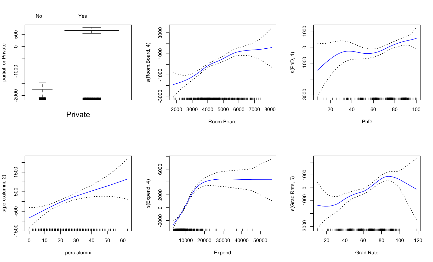 library(gam) fit <- gam(Outstate ~ Private + s(Room.Board, 4) + s(PhD, 4) + s(perc.alumni, 2) + s(Expend, 4) + s(Grad.Rate, 5), data=College[train, ]) par(mfrow = c(2, 3)) plot(fit, col = "blue", se = TRUE)