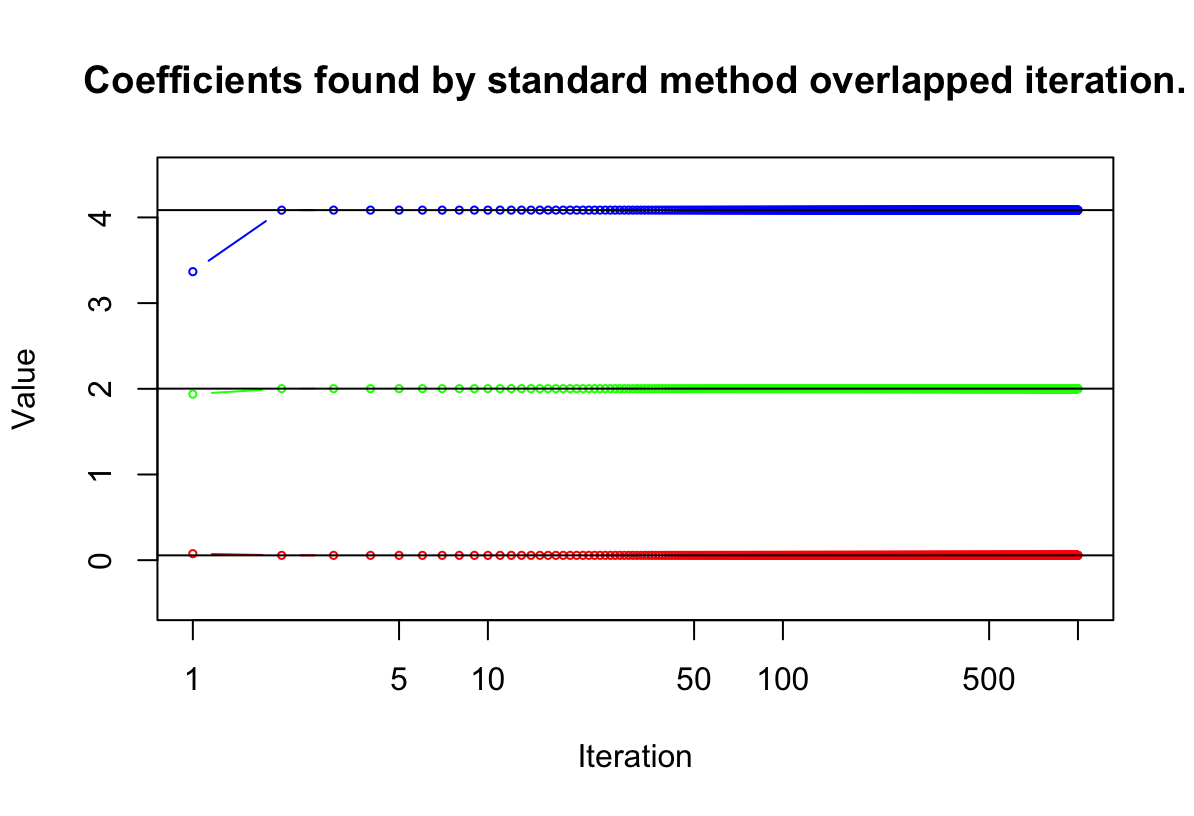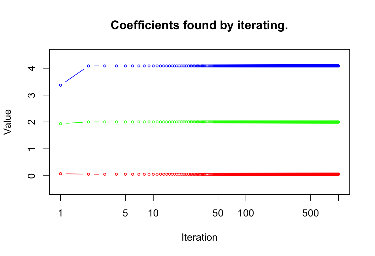 beta.df = data.frame("beta0" = rep(0, 1000), "beta1" = rep(0, 1000), "beta2" = rep(0, 1000)) beta1 <- 20 for (i in 1:1000){ a = y - beta1 * x1 model = lm(a ~ x2) beta2 = model$coef[2] beta.df$beta2[i]= beta2 a = y - beta2 * x2 model = lm(a ~ x1) beta1 <- model$coef[2] beta.df$beta1[i] = beta1 beta.df$beta0[i] = model$coef[1] } plot(1:1000, beta.df$beta2, ylim = range(-0.5:4.5), type = 'b', cex = 0.5, col = "blue", xlab = "Iteration", ylab = "Value", log = "x") title("Coefficients found by iterating.") lines(1:1000, beta.df$beta1, col = "red", type = 'b', cex = 0.5) lines(1:1000, beta.df$beta0, col = "green", type = 'b', cex = 0.5)