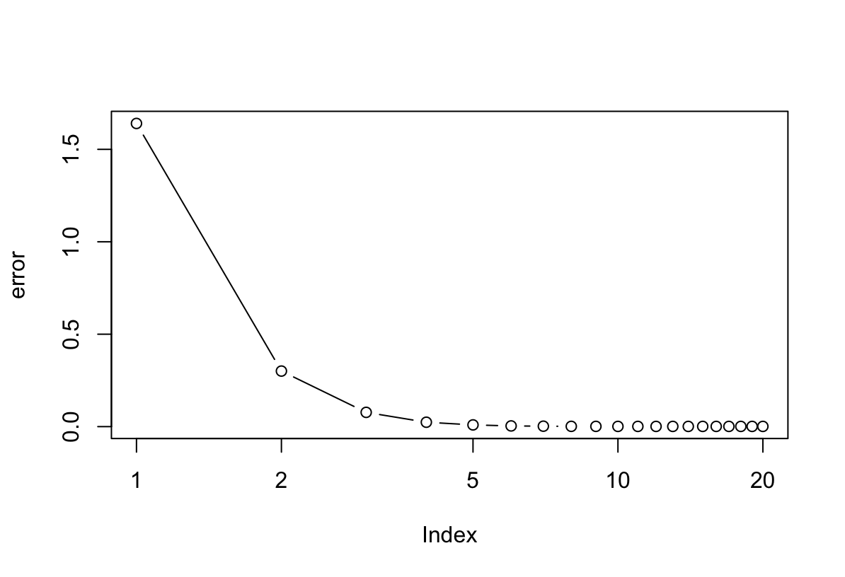 set.seed(1) p <- 100 n <- 1000 betas <- rnorm(p) * 5 x <- matrix(rnorm(n * p), ncol = p, nrow = n) y <- 8 + (x %*% betas) + rnorm(n) fit <- lm(y ~ x) iter = 20 beta <- matrix(0, ncol = ncol(x), nrow = iter + 1) for (i in 1:iter) { for (k in 1:ncol(x)) { residual <- y - (x[, -k] %*% beta[i, -k]) beta[i + 1, k] <- lm(residual ~ x[, k])$coef[2] } } res <- beta[-1, ] error <- rowMeans(sweep(res, 2, betas)^2) plot(error, log = "x", type = "b")