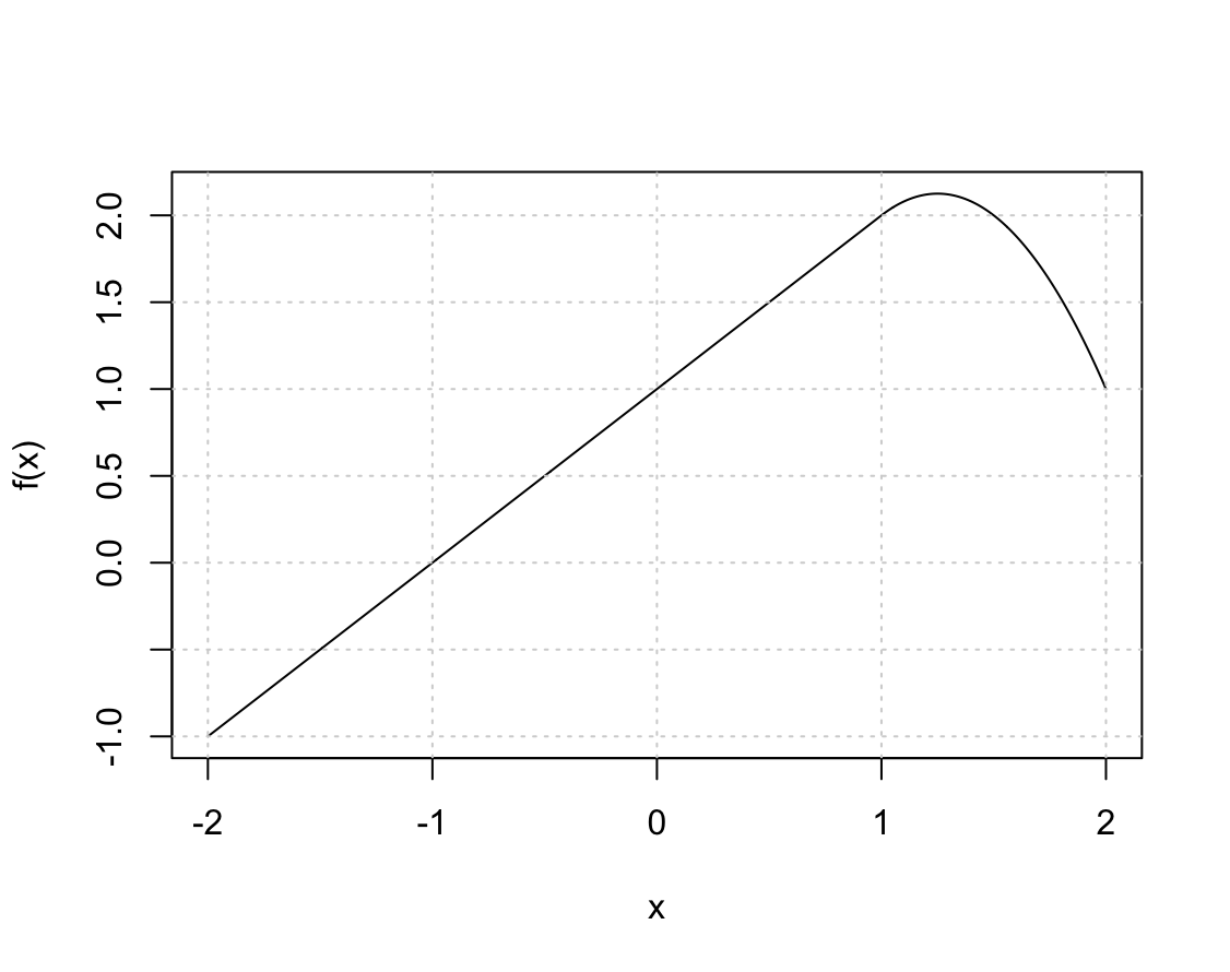 x <- seq(-2, 2, length.out = 1000) f <- function(x) 1 + x + -2 * (x - 1)^2 * I(x >= 1) plot(x, f(x), type = "l") grid()