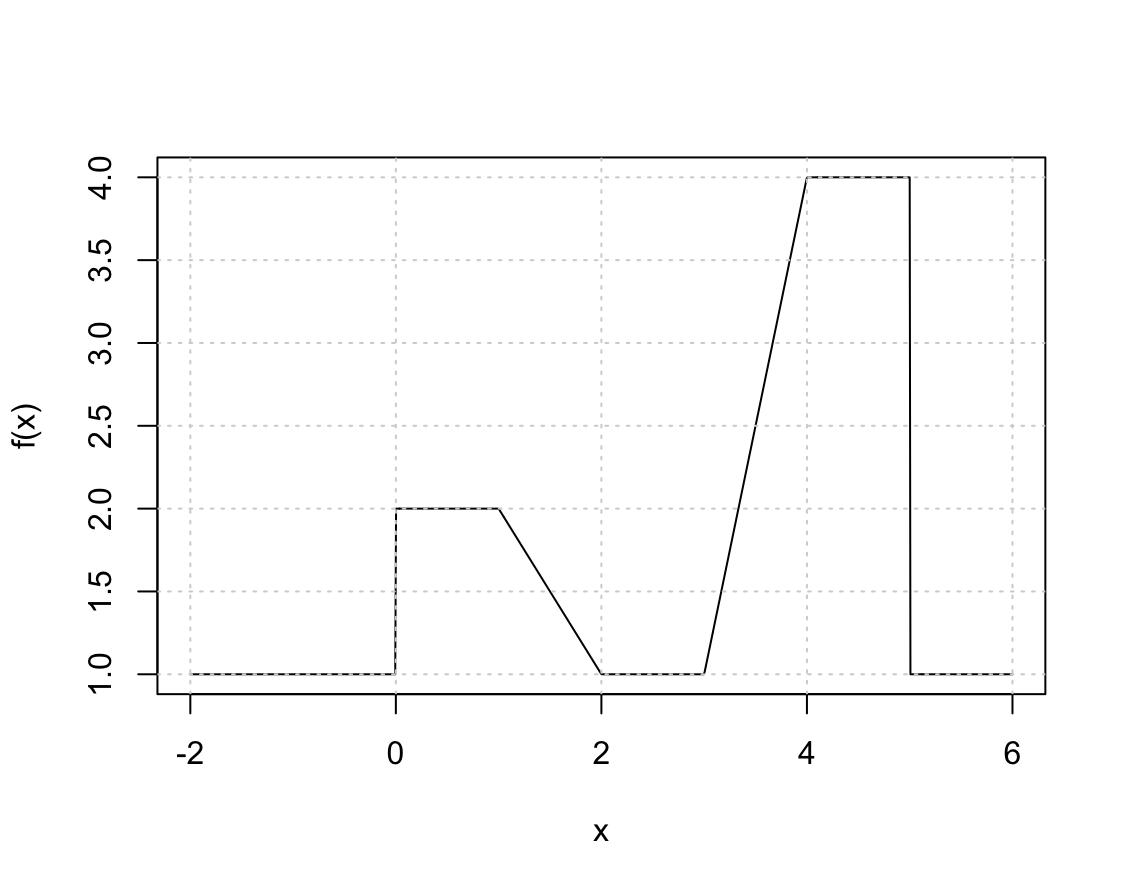 x <- seq(-2, 6, length.out = 1000) b1 <- function(x) I(0 <= x & x <= 2) - (x - 1) * I(1 <= x & x <= 2) b2 <- function(x) (x - 3) * I(3 <= x & x <= 4) + I(4 < x & x <= 5) f <- function(x) 1 + 1 * b1(x) + 3 * b2(x) plot(x, f(x), type = "l") grid()