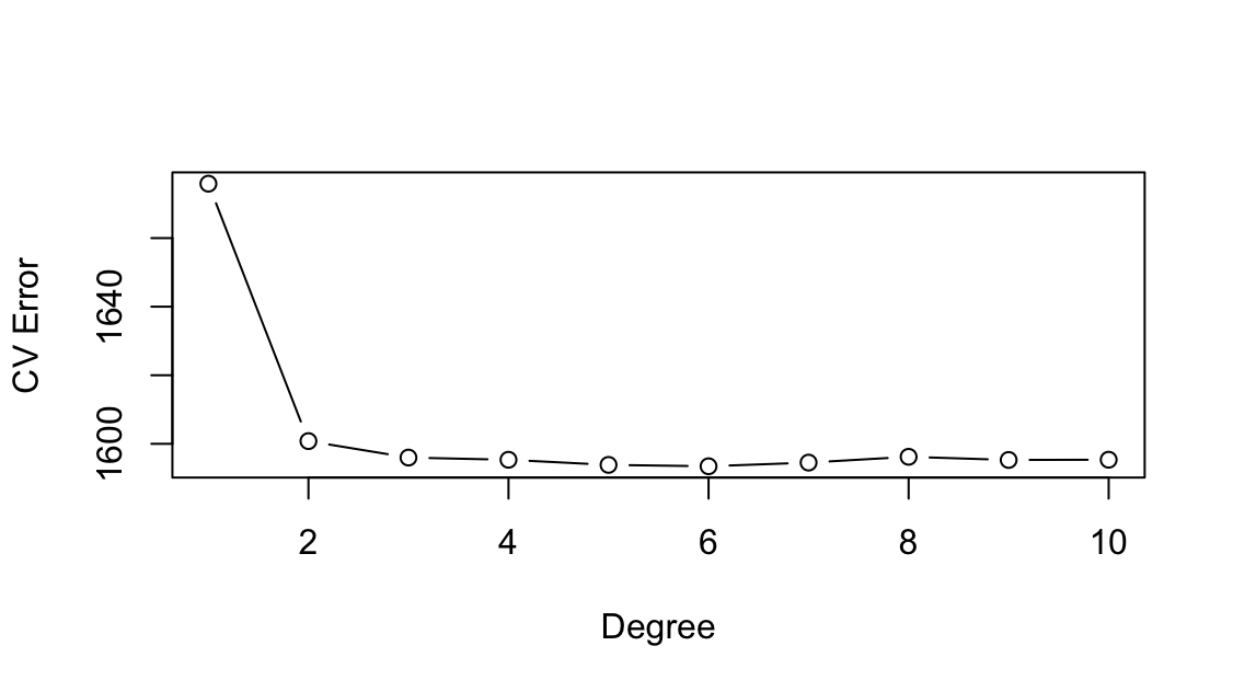 library(boot) set.seed(1) cv.error <- rep(0, 10) for (i in 1:10) { fit <- glm(nox ~ poly(dis, i), data = Boston) cv.error[i] <- cv.glm(Boston, fit, K = 10)$delta[1] } which.min(cv.error)[1] 4(d) Use the
