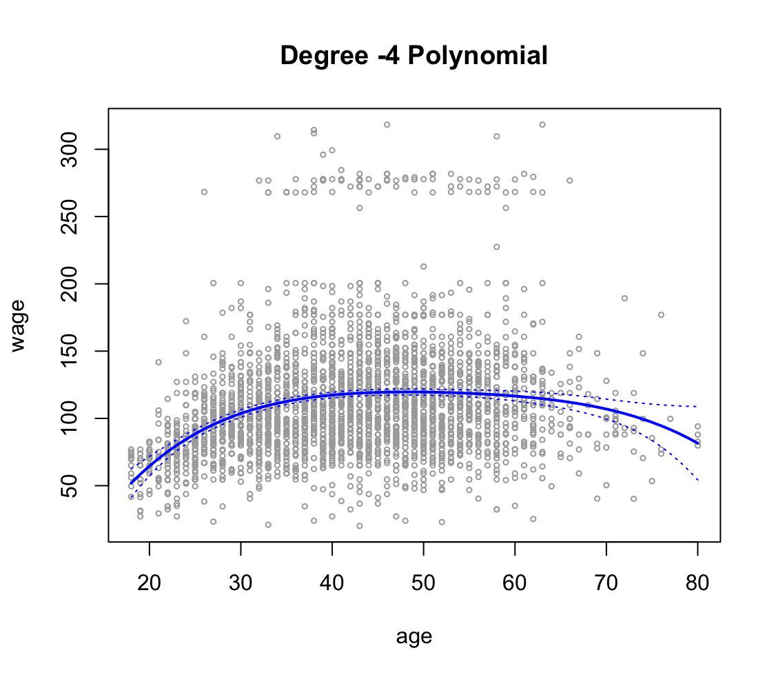 agelims <- range(age) age.grid <- seq(from = agelims[1], to = agelims[2]) preds <- predict(fit4, newdata = list(age = age.grid ), se = TRUE ) se.bands <- cbind(preds$fit + 2 * preds$se.fit, preds$fit - 2 * preds$se.fit) plot(age, wage, xlim = agelims, cex = .5, col = "darkgrey") title("Degree -4 Polynomial") lines(age.grid, preds$fit, lwd = 2, col = "blue") matlines(age.grid, se.bands, lwd = 1, col = "blue", lty = 3)