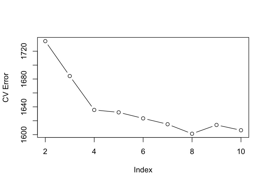 wageusingage, and perform cross-validation to choose the optimal number of cuts. Make a plot of the fit obtained.Wage_2 <- Wage attach(Wage_2) set.seed(1) cv.error = rep(0,9) for (i in 2:10) { Wage_2$age.cut = cut(age, i) step.fit = glm(wage ~ age.cut, data = Wage_2) cv.error[i-1] = cv.glm(Wage_2, step.fit, K=10)$delta[1] } cv.error[1] 1734.489 1684.271 1635.552 1632.080 1623.415 1614.996 1601.318 [8] 1613.954 1606.331plot(2:10, cv.error, type="b", xlab="Index", ylab="CV Error")