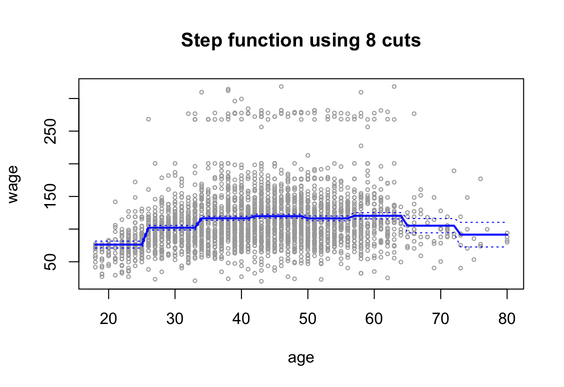 attach(Wage) step.fit <- glm(wage ~ cut(age, 8), data = Wage) preds <- predict(step.fit, newdata = list(age = age.grid), se = TRUE) se.bands <- cbind(preds$fit + 2 * preds$se.fit, preds$fit - 2 * preds$se.fit) plot(age, wage, xlim = agelims, cex = .5, col = "darkgrey") title("Step function using 8 cuts") lines(age.grid, preds$fit, lwd = 2, col = "blue") matlines(age.grid, se.bands, lwd = 1, col = "blue", lty = 3)