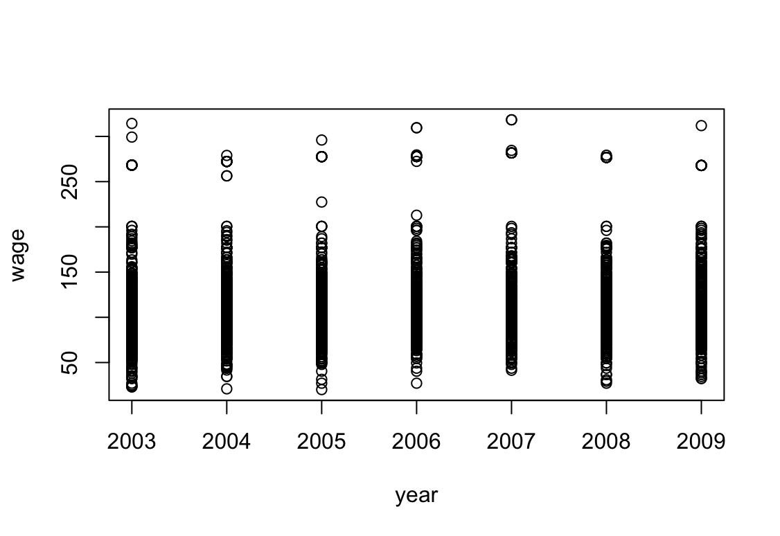 Wagedata set contains a number of other features not explored in this chapter, such as marital status (maritl), job class (jobclass), and others. Explore the relationships between some of these other predictors andwage, and use non-linear fitting techniques in order to fit flexible models to the data. Create plots of the results obtained, and write a summary of your findings.library(ISLR2) attach(Wage) plot(year, wage)