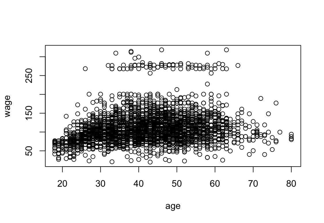 glm.fit = glm(wage ~ poly(age, 5), data = Wage) summary(glm.fit)Call: glm(formula = wage ~ poly(age, 5), data = Wage) Coefficients: Estimate Std. Error t value Pr(>|t|) (Intercept) 111.7036 0.7288 153.278 < 2e-16 *** poly(age, 5)1 447.0679 39.9161 11.200 < 2e-16 *** poly(age, 5)2 -478.3158 39.9161 -11.983 < 2e-16 *** poly(age, 5)3 125.5217 39.9161 3.145 0.00168 ** poly(age, 5)4 -77.9112 39.9161 -1.952 0.05105 . poly(age, 5)5 -35.8129 39.9161 -0.897 0.36968 --- Signif. codes: 0 ‘***’ 0.001 ‘**’ 0.01 ‘*’ 0.05 ‘.’ 0.1 ‘ ’ 1 (Dispersion parameter for gaussian family taken to be 1593.294) Null deviance: 5222086 on 2999 degrees of freedom Residual deviance: 4770322 on 2994 degrees of freedom AIC: 30642 Number of Fisher Scoring iterations: 2Na podstawie $p$-value 5 stopień wielomianu nie jest istotny statystycznie.