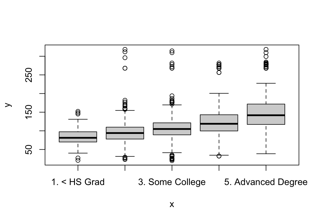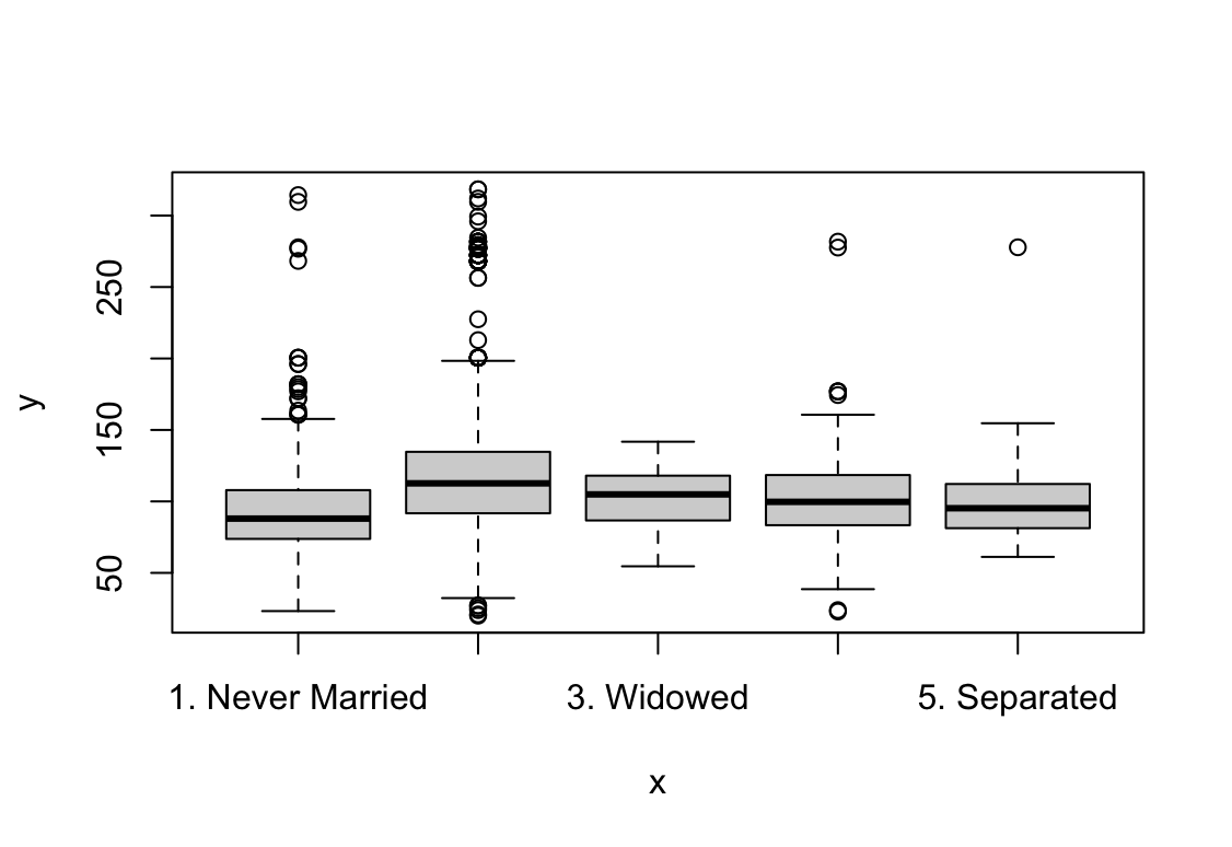 Wynik pokazuje, że pensja rośnie wraz z każdym kolejnym rokiem kiedy weźmiemy ustalone wartości pozostałych zmiennych. W przypadku wieku pensja jest najwyższa dla ludzi w wieku ok. 42 lat. Wyższa edukacja pozwala na uzyskanie wyższych zarobków. Praca w usługach jest lepiej płatna. Zarobki osób po ślubie są wyższe, dla wdowców i osób w separacji widzimy szeroki zakres błędu standardowego.