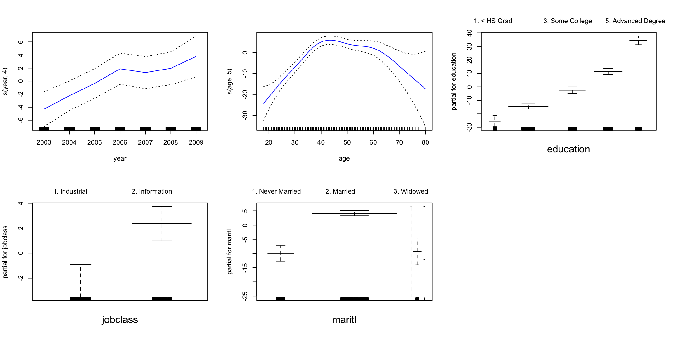 Wagezawiera zmienne ilościowe i jakościowe. Ponadto zmienne ilościowe nie są liniowe, więc dobrym wyborem do modelowania są modele GAM.library(gam) fit0 <- gam(wage ~ s(year, 4) + s(age, 5) + education, data = Wage) fit2 <- gam(wage ~ s(year, 4) + s(age, 5) + education + maritl, data = Wage) fit1 <- gam(wage ~ s(year, 4) + s(age, 5) + education + jobclass, data = Wage) fit3 <- gam(wage ~ s(year, 4) + s(age, 5) + education + jobclass + maritl, data = Wage) anova(fit0, fit1, fit2, fit3)Analysis of Deviance Table Model 1: wage ~ s(year, 4) + s(age, 5) + education Model 2: wage ~ s(year, 4) + s(age, 5) + education + jobclass Model 3: wage ~ s(year, 4) + s(age, 5) + education + maritl Model 4: wage ~ s(year, 4) + s(age, 5) + education + jobclass + maritl Resid. Df Resid. Dev Df Deviance Pr(>Chi) 1 2986 3689770 2 2985 3677553 1 12218 0.0014286 ** 3 2982 3595688 3 81865 1.071e-14 *** 4 2981 3581781 1 13907 0.0006687 *** --- Signif. codes: 0 ‘***’ 0.001 ‘**’ 0.01 ‘*’ 0.05 ‘.’ 0.1 ‘ ’ 1Model z największą liczbą zmiennych nadal jest istotny statystycznie.