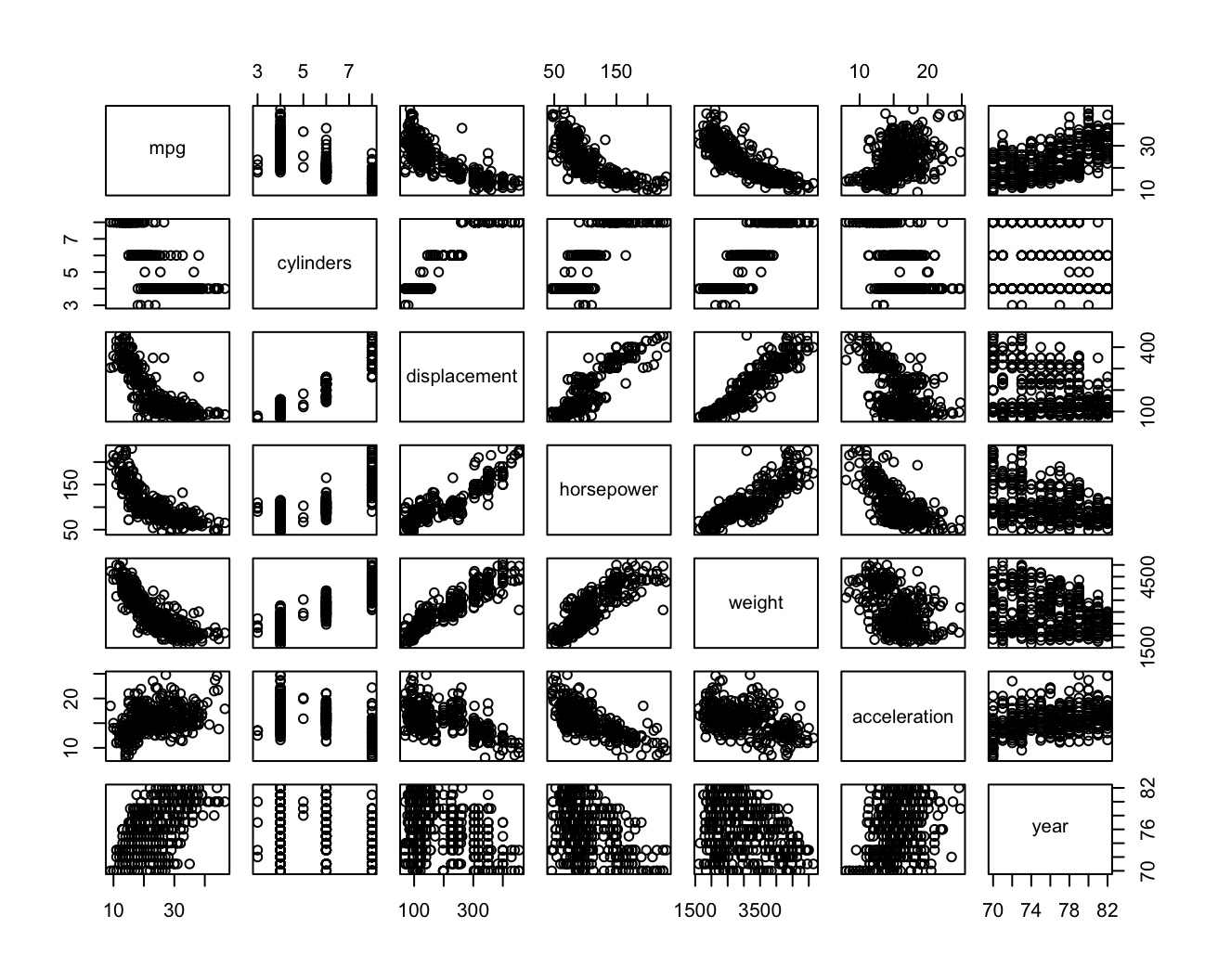 Autodata set. Is there evidence for non-linear relationships in this data set? Create some informative plots to justify your answer.library(ISLR2) attach(Auto) pairs(Auto[1:7])