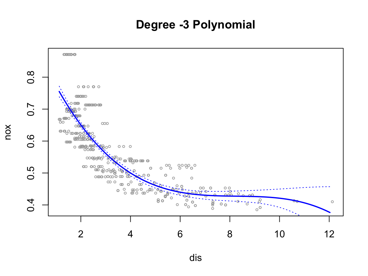 poly()function to fit a cubic polynomial regression to predictnoxusingdis. Report the regression output, and plot the resulting data and polynomial fits.library(ISLR2) attach(Boston) fit <- glm(nox ~ poly(dis, 3), data = Boston) summary(fit)Call: glm(formula = nox ~ poly(dis, 3), data = Boston) Coefficients: Estimate Std. Error t value Pr(>|t|) (Intercept) 0.554695 0.002759 201.021 < 2e-16 *** poly(dis, 3)1 -2.003096 0.062071 -32.271 < 2e-16 *** poly(dis, 3)2 0.856330 0.062071 13.796 < 2e-16 *** poly(dis, 3)3 -0.318049 0.062071 -5.124 4.27e-07 *** --- Signif. codes: 0 ‘***’ 0.001 ‘**’ 0.01 ‘*’ 0.05 ‘.’ 0.1 ‘ ’ 1 (Dispersion parameter for gaussian family taken to be 0.003852802) Null deviance: 6.7810 on 505 degrees of freedom Residual deviance: 1.9341 on 502 degrees of freedom AIC: -1370.9 Number of Fisher Scoring iterations: 2lims <- range(dis) grid <- seq(from = lims[1], to = lims[2], 0.1) preds <- predict(fit, newdata = list(dis = grid), se = TRUE) se.bands <- cbind(preds$fit + 2 * preds$se.fit, preds$fit - 2 * preds$se.fit) plot(dis, nox, xlim = lims, cex = .5, col = "darkgrey") title("Degree -3 Polynomial") lines(grid, preds$fit, lwd = 2, col = "blue") matlines(grid, se.bands, lwd = 1, col = "blue", lty = 3)