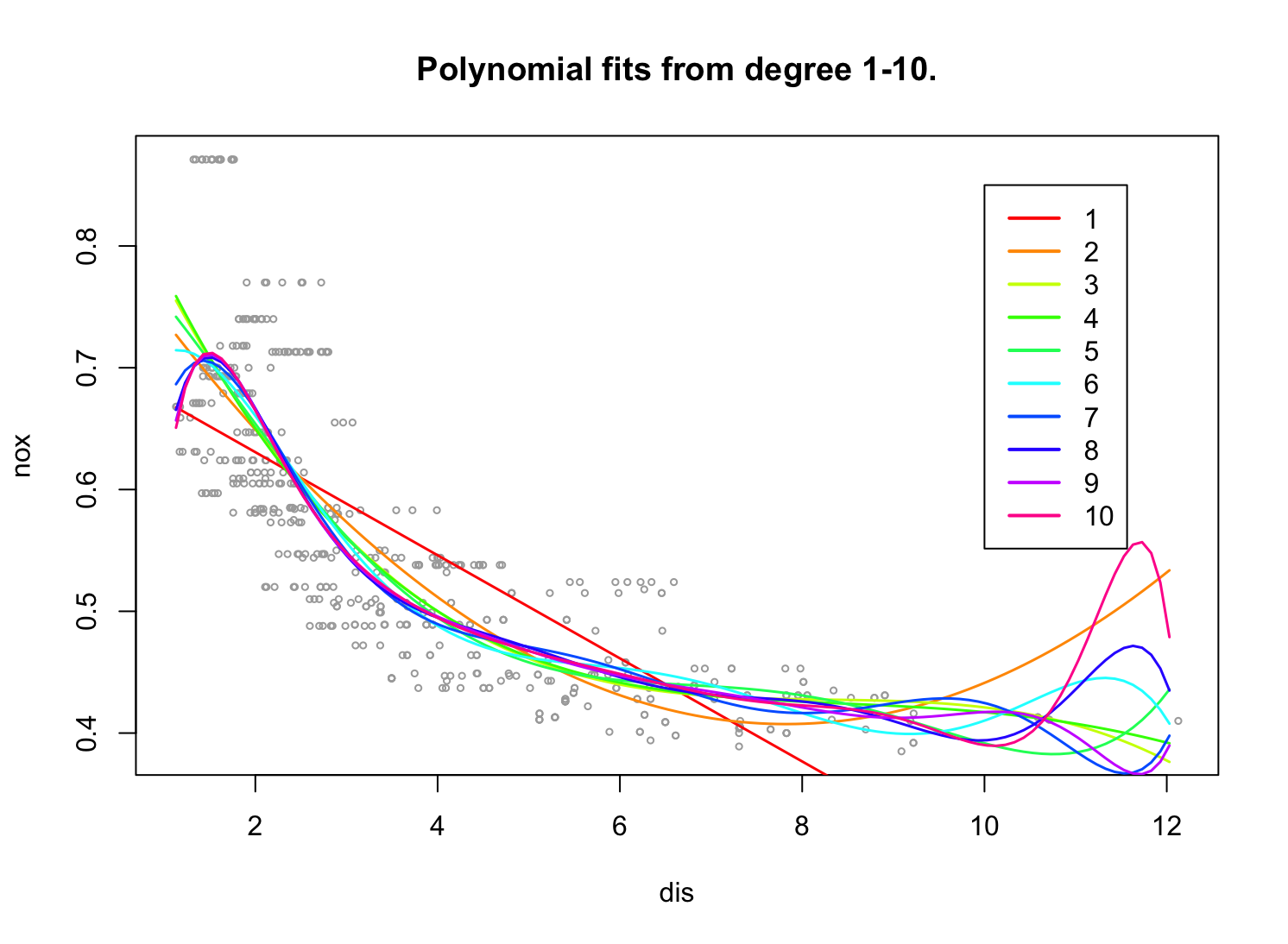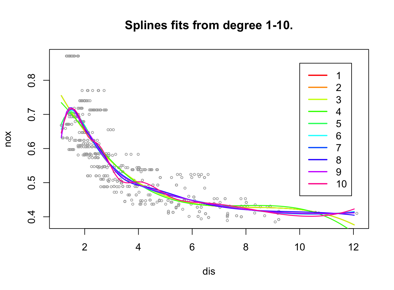 plot(dis, nox, xlim = lims, cex = .5, col = "darkgrey") title("Splines fits from degree 1-10.") colours = rainbow(10) rss = rep(0,10) set.seed(1) for (i in 1:10){ fit <- glm(nox ~ bs(dis, df = i), data = Boston) preds <- predict(fit, newdata = list(dis = grid), se = TRUE) lines(grid, preds$fit, lwd = 1.5, col = colours[i]) rss[i] <- sum((nox - predict(fit, newdata = list(dis = dis)))^2) } legend(x = 10, y = 0.85, legend = 1:10, col = colours[1:10], lwd = 2) rss[1] 1.934107 1.934107 1.934107 1.922775 1.840173 1.833966 1.829884 1.816995 [9] 1.825653 1.792535