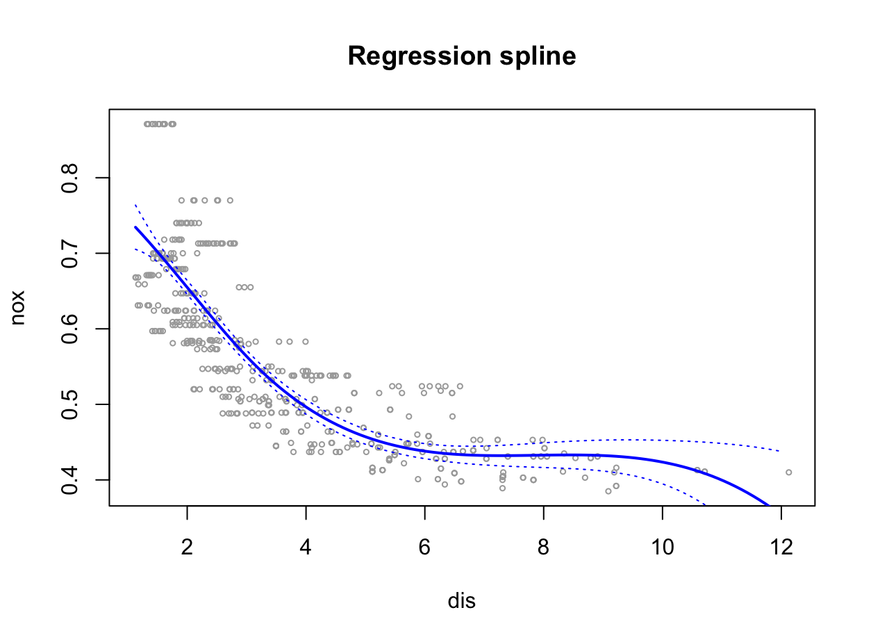 preds <- predict(fit, newdata = list(dis = grid), se = TRUE) se.bands <- cbind(preds$fit + 2 * preds$se.fit, preds$fit - 2 * preds$se.fit) plot(dis, nox, xlim = lims, cex = .5, col = "darkgrey") title("Regression spline") lines(grid, preds$fit, lwd = 2, col = "blue") matlines(grid, se.bands, lwd = 1, col = "blue", lty = 3)